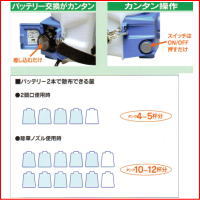 ■バッテリー2本で散布できる量 ・2頭口使用時・・・タンク4〜5杯分 ・除草ノズル使用時・・・タンク10〜12杯分